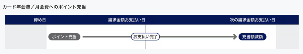 年会費をポイント充当するスケジュールはこのようになっていて、ポイント充当してから年会費の引き落としが入り、その次の支払日で減額となります。