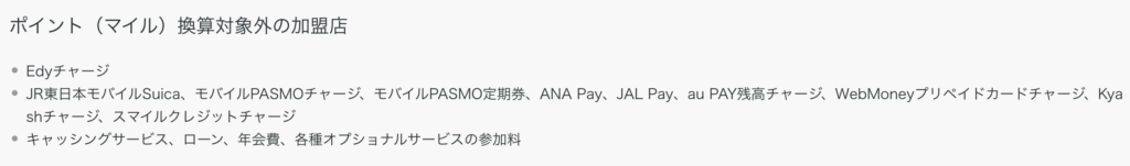 Suica、PASMO、JALPayなどは特典のカウント対象ですが、通常利用ポイント(1%還元)は対象外です。