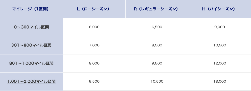 この0〜300マイル区間を移動しようと思うと、シーズン(L、R、H)によりますが改定後で片道12,000〜26,000マイル必要です。