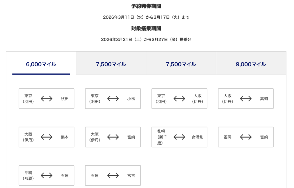 - 東京(羽田)⇔大阪(伊丹):9,000マイル ※片道(2025年)