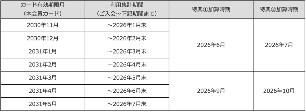 特典①の50,000ポイントは9月、特典②の50,000マイルは10月です