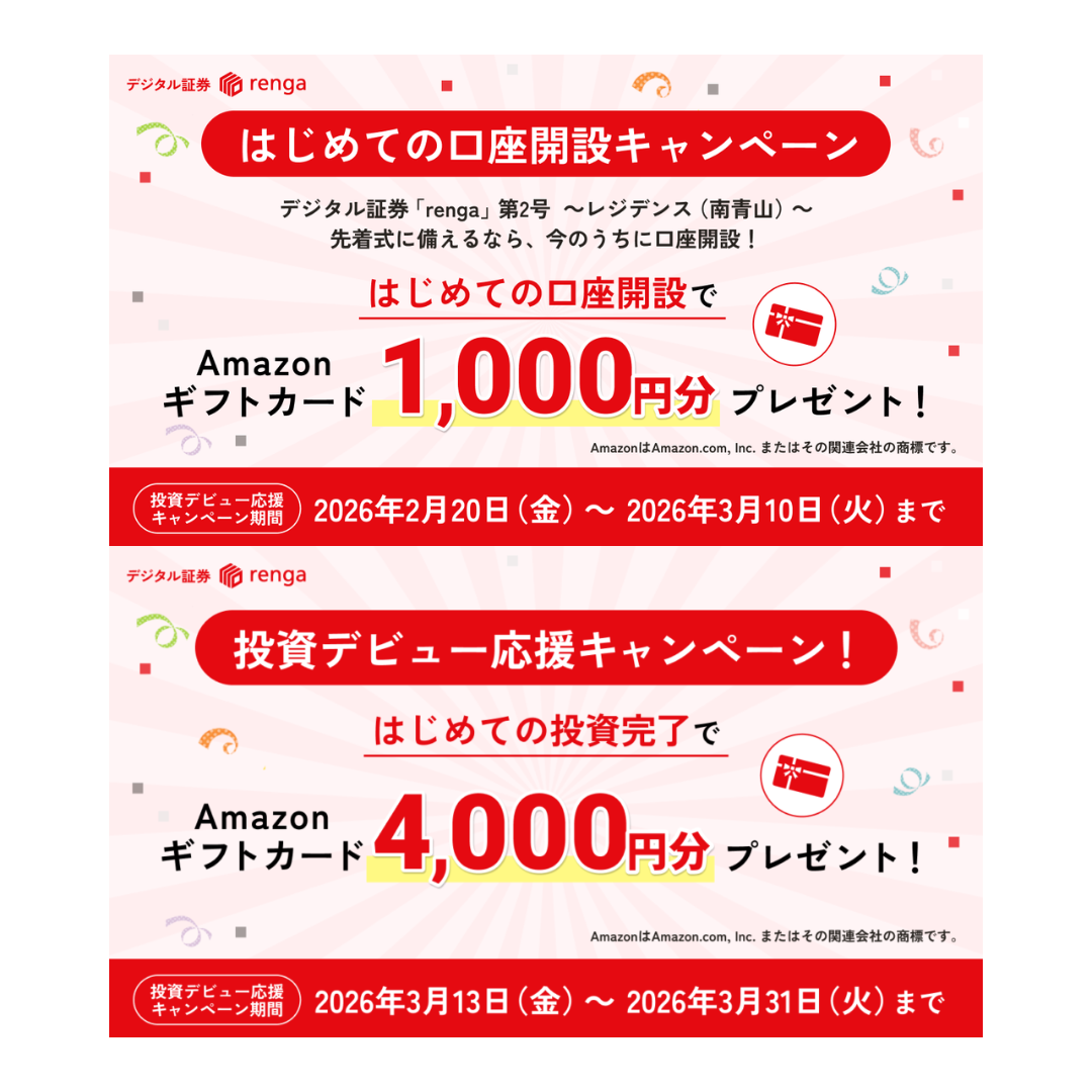デジタル証券「renga」に口座開設し、3月13日(金)20:00〜先着募集開始される2号ファンドに10万出資すると合計5,000円分のAmazonギフト券がもらえます🙌