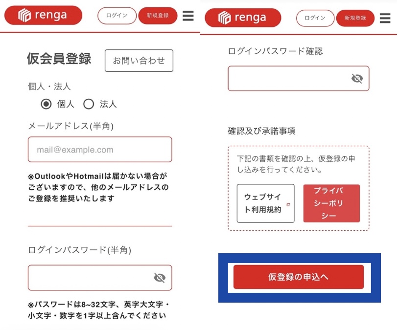 メールアドレス・ログインパスワードを入力し、「仮登録の申込へ」ボタンをタップします