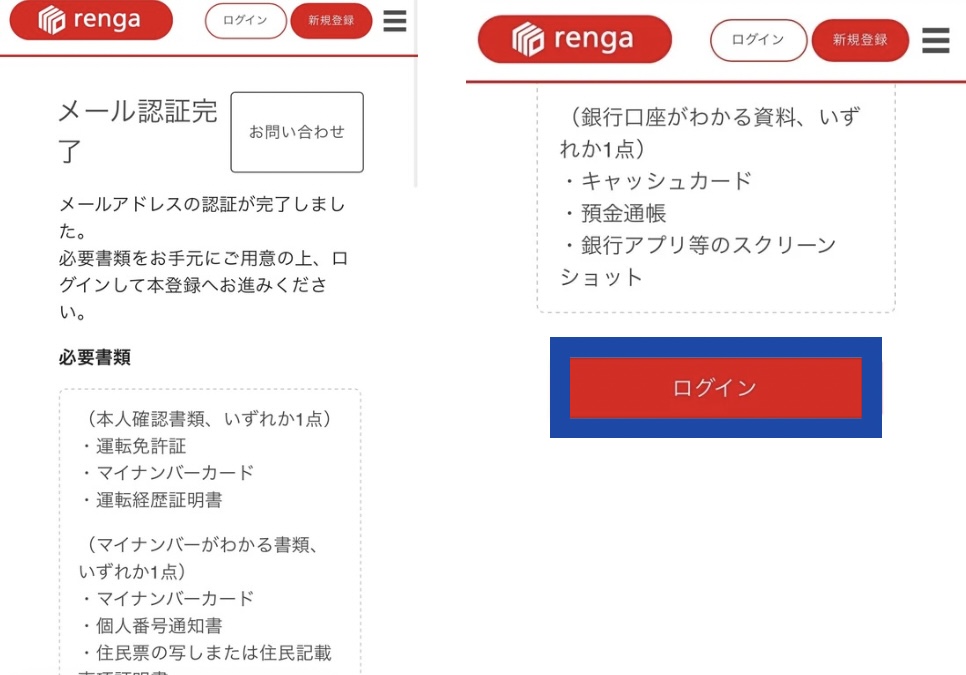メール認証完了画面で、「ログイン」ボタンをタップします