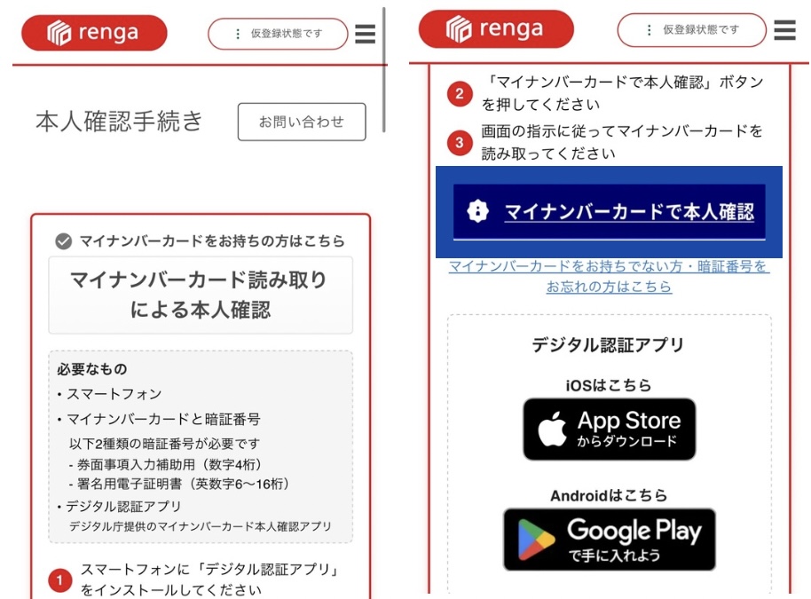 本人確認手続きの選択画面で「マイナンバーカードで本人確認」ボタンをタップします