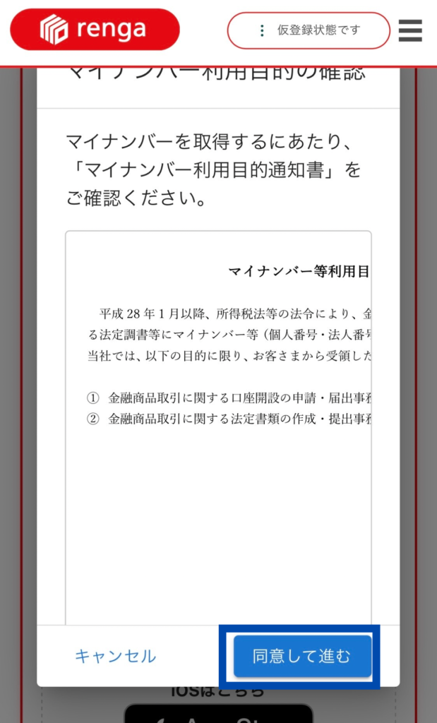 マイナンバー利用目的の確認画面で、「同意して進む」ボタンをタップします
