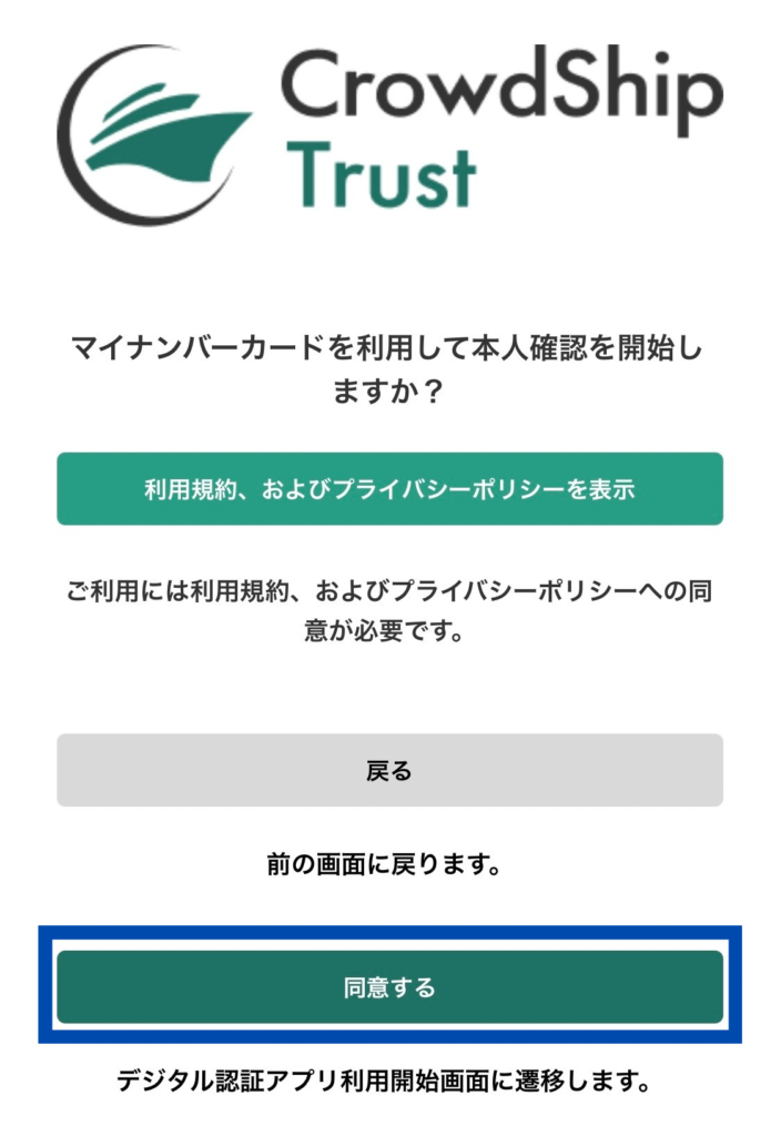 画面の案内に従って利用規約等を確認し、「同意する」ボタンをタップします