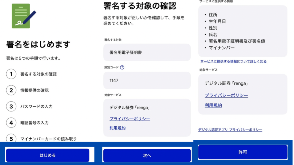 「はじめる」→「次へ」→「許可」ボタンを順にタップします