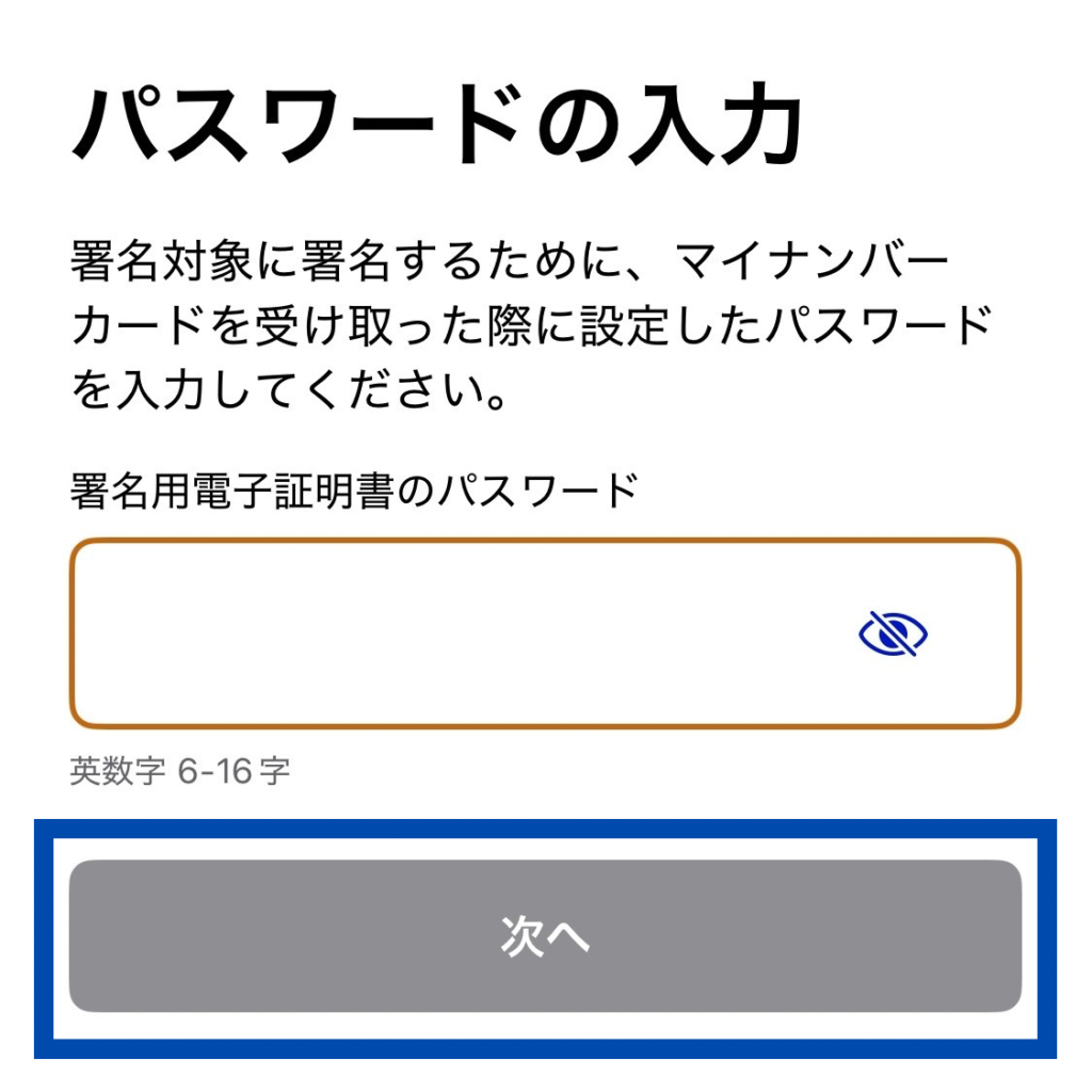 署名用電子証明書のパスワードを入力し「次へ」ボタンをタップします
