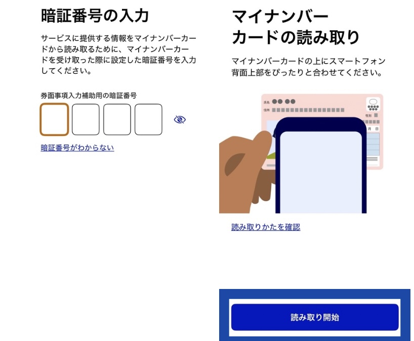 券面事項入力補助用の暗証番号を入力し、「読み取り開始」ボタンをタップします
