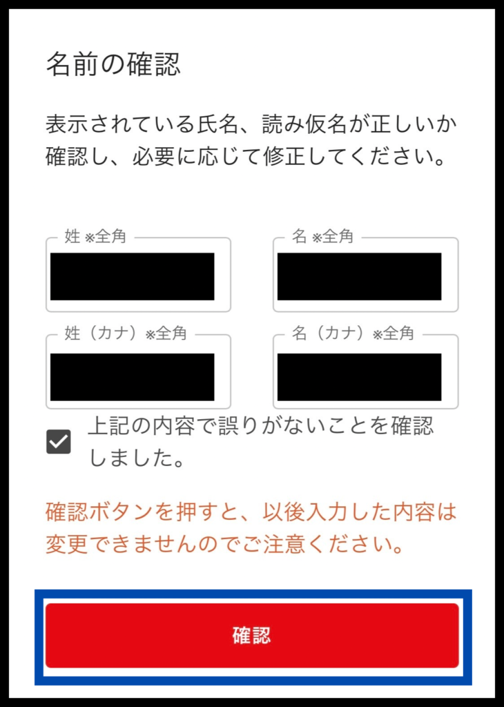 名前を確認しチェックボックスにチェックして、「確認」ボタンをタップします