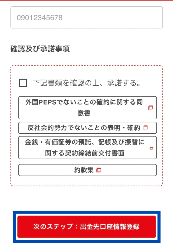 入力後、「次のステップ:出金先口座情報登録」をタップします