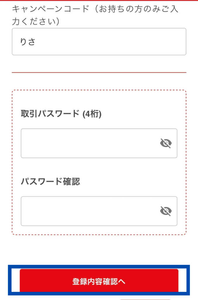 取引パスワードを入力し、「登録内容確認へ」ボタンをタップします