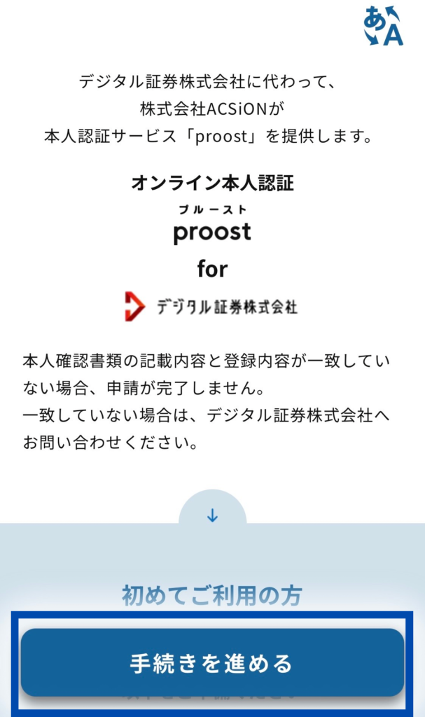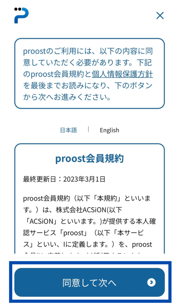 本人認証サービス「proost」の画面で、「手続きを進める」をタップします