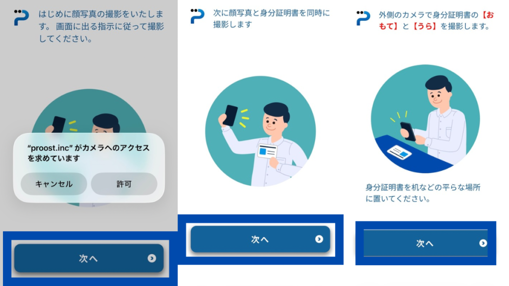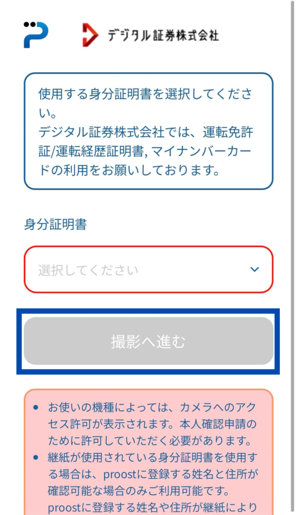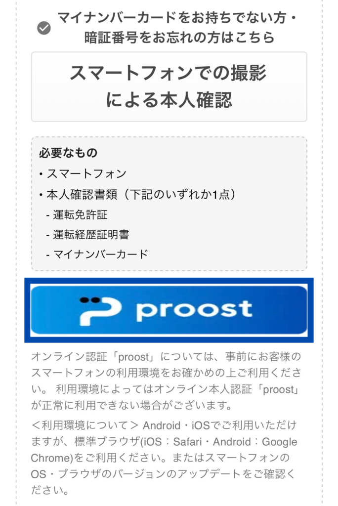 本人確認手続きの選択画面で「スマートフォンでの撮影による本人確認(proost)」ボタンをタップします