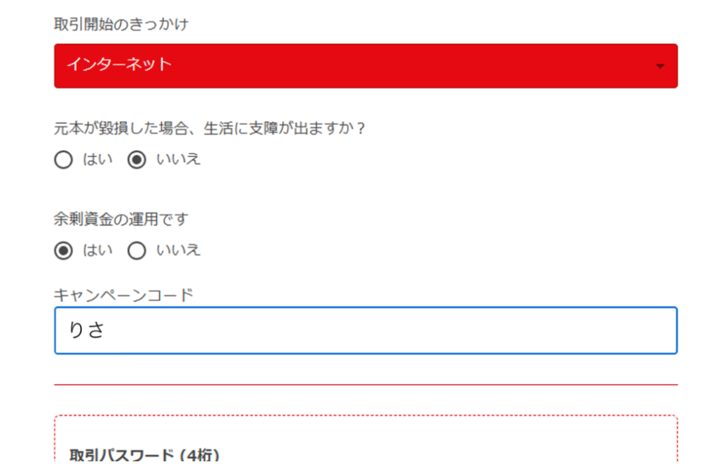- 条件:限定リンクからの口座開設+キャンペーンコード「りさ」の入力