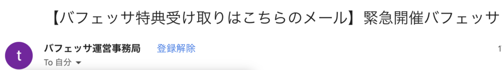 最後まで見ると「【バフェッサ特典受け取りはこちらのメール】緊急開催バフェッサ祭り」という件名のメールが届く