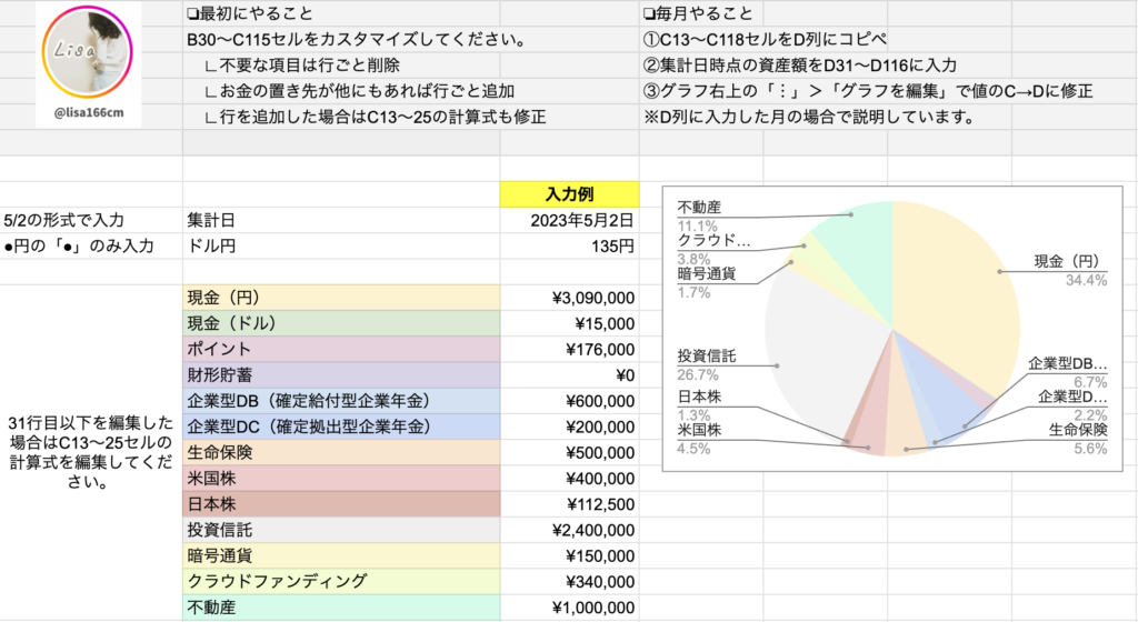 これを毎月月初に更新して、自分の資産を管理しています♪